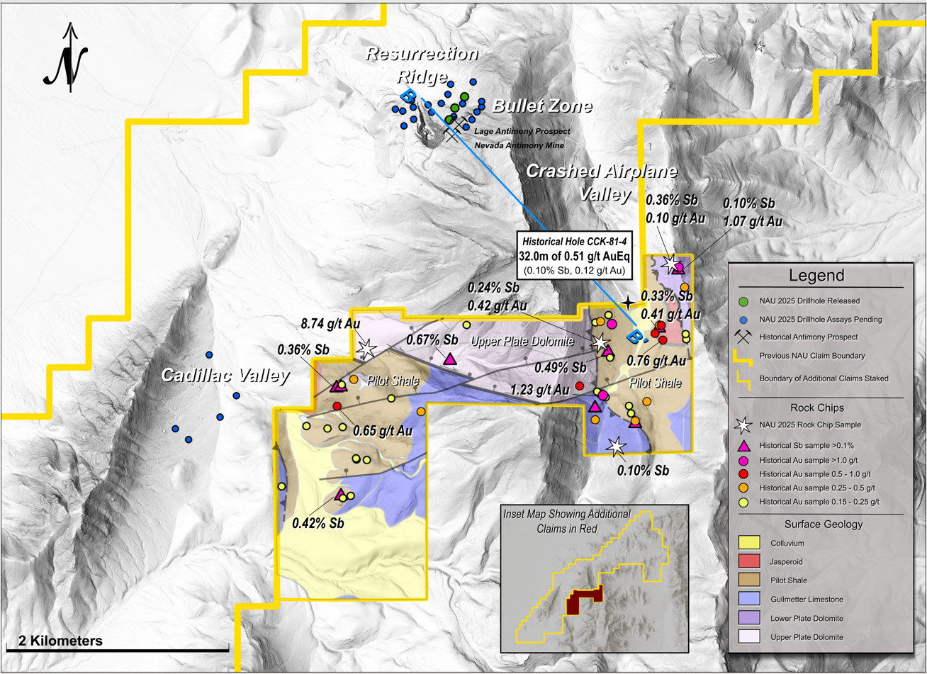 - The new claims encompass remaining surface exposure of a dolomite-over-Pilot Shale thrust block, as well as exposed Pilot Shale on both the west and east of the dolomite thrust; this geological setting is where the 2025 Bullet Zone drilling discovered significant antimony and gold mineralization (See News Release dated December 2, 2025).