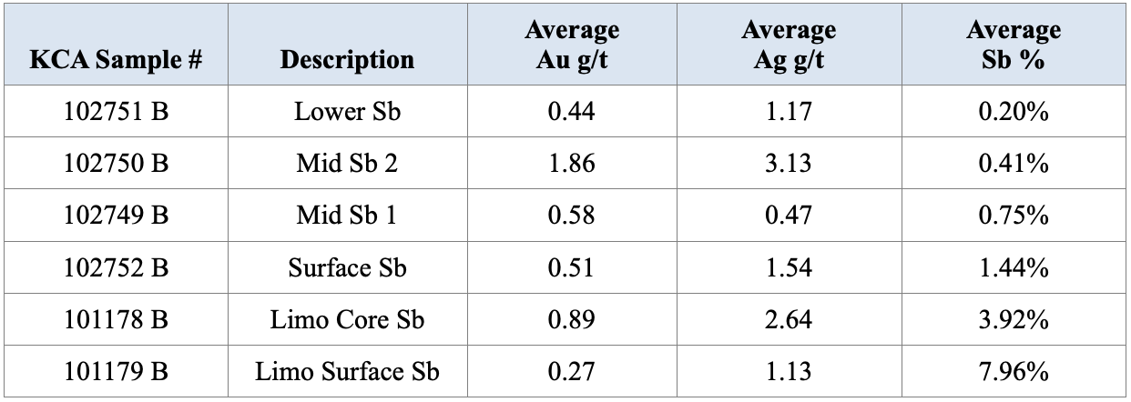 Composite samples of 20-kilogram were sent to the Kappes, Cassiday & Associates laboratory (KCA) in Reno, Nevada, for initial antimony recovery metallurgical test work. The core samples were composed of material from the Resurrection Ridge and Cadilac Valley target areas ranging from 64 meters to 377 meters deep. The surface outcrop sample was taken from several outcrops in the historically mined Golden Butte pit, and the nearby Nevada Antimony Mine prospect. Both the surface and core samples contained antimony oxide with minor antimony sulphide minerals. Head assays for the composite samples are summarized in Table 1.