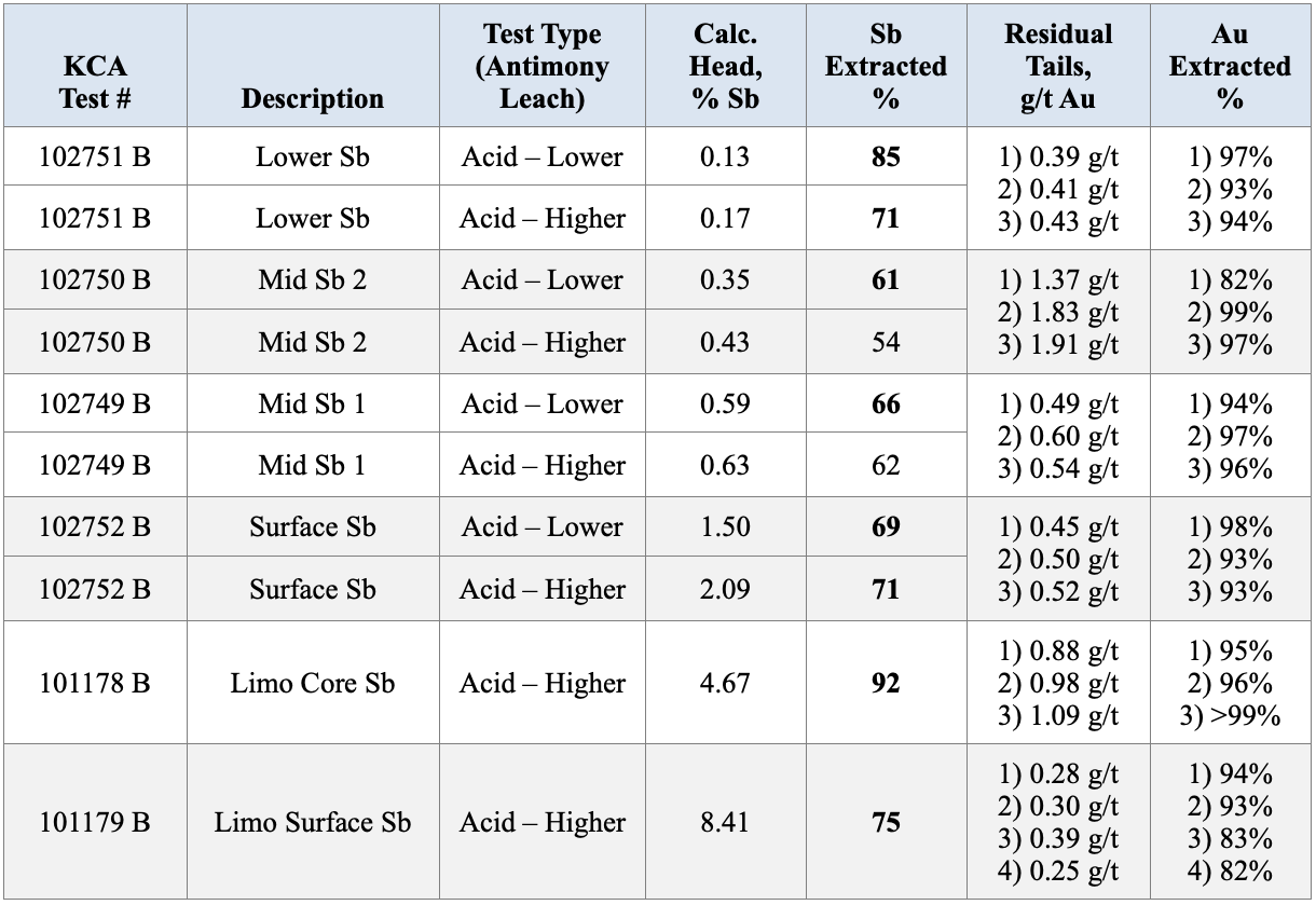 The metallurgical work was carried out by Kappes, Cassiday and Associates based in Reno, Nevada. Head assays were ground to 80% passing 0.075mm and analyzed by standard 30g gold fire assay and multi-elemental analysis ICP-OES methods. Antimony leach test samples were milled to 80% passing 0.045mm. The acid leach tests were leached at 80oC for 8 hours. Gold cyanide shake leach tests were conducted using portions of the pulverized tails material after the antimony leaching.