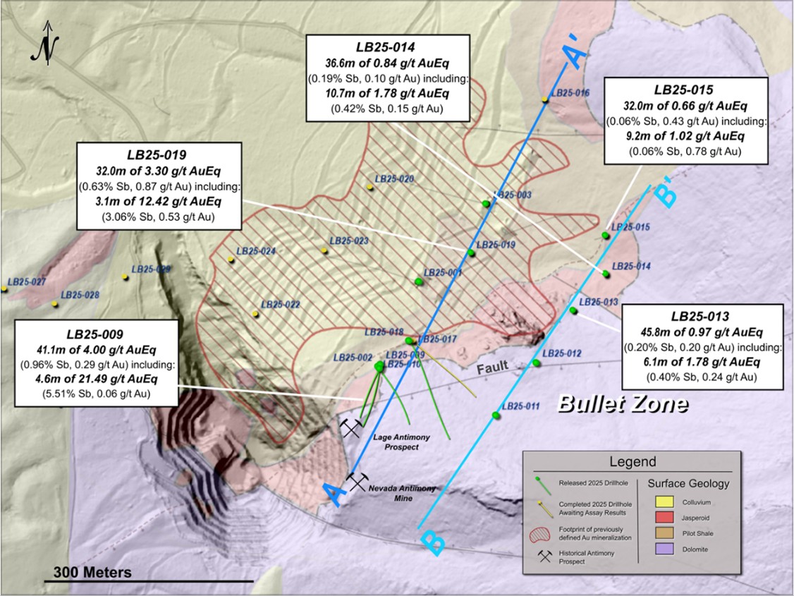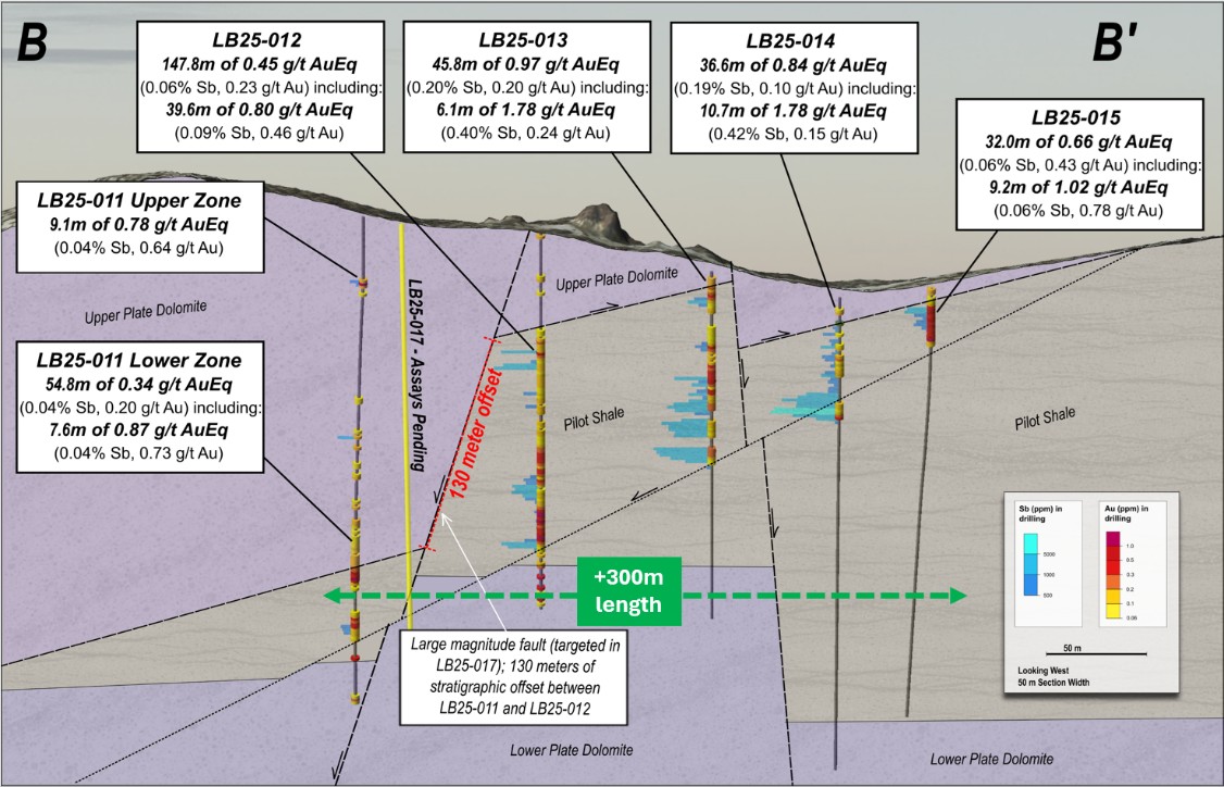 - LB25-019 (antimony infill, gap in antimony data): 12.42 g/t AuEq* over 3.1 meters (3.06% Sb and 0.53 g/t Au), within 3.30 g/t AuEq* over 32.0 meters (0.63% Sb and 0.87 g/t Au)