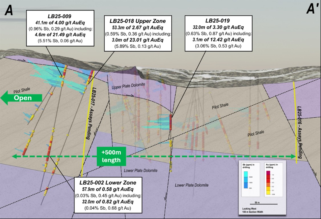 - LB25-013 (step-out over 150 meters east): 1.37 g/t AuEq* over 21.4 meters (0.31% Sb and 0.16 g/t Au) within 0.97 g/t AuEq* over 45.8 meters (0.20% Sb and 0.20 g/t Au)
