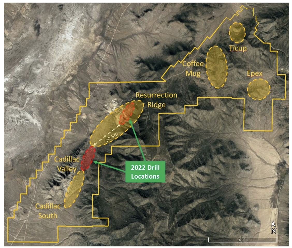 - 2023 Work Program Update: the geological model at the Project is currently being updated to incorporate the 2022 drill results. The successful 2022 drill program identified numerous drill targets with the potential to infill and expand the mineralized footprints at Resurrection Ridge and Cadillac Valley to advance to a resource estimate (see Figure 1). Additionally, exciting new exploration targets have been identified in untested parts of the Project not previously accessible under the Exploration Notice permits. Drilling is planned for 2023 once geologic interpretation and targeting is complete.