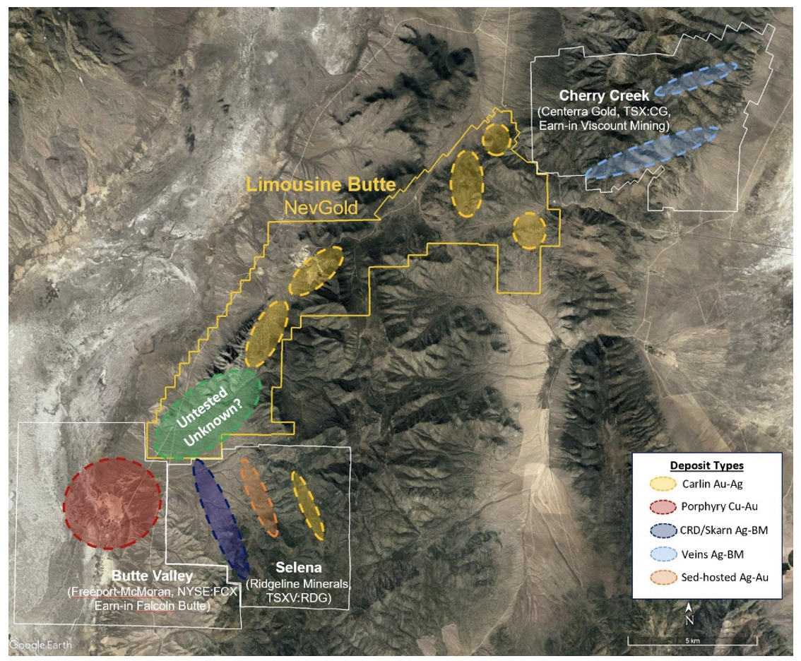 NevGold is an exploration and development company targeting large-scale mineral systems in the proven districts of Nevada, Idaho, and British Columbia. NevGold owns a 100% interest in the Limousine Butte and Cedar Wash gold projects in Nevada, and the Ptarmigan silver-polymetallic project in Southeast BC, and has an option to acquire 100% of the Nutmeg Mountain gold project in Idaho.