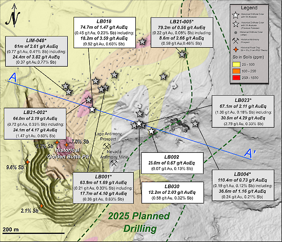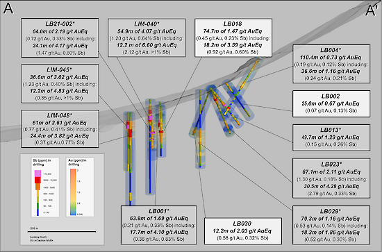 - LB-006: 2.46 g/t AuEq* over 86.9 meters (0.30% Sb and 1.11 g/t Au), including 5.75 g/t AuEq* over 12.8 meters (0.87% Sb and 1.83 g/t Au), and also including 6.77 g/t AuEq* over 6.7 meters (+1% Sb and 2.29 g/t Au)
