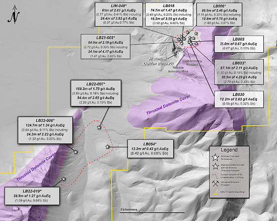 - LB-001: 1.69 g/t AuEq* over 63.9 meters (0.33% Sb and 0.21 g/t Au), including 4.10 g/t AuEq* over 17.7 meters (0.83% Sb and 0.38 g/t Au), and also including 4.64 g/t AuEq* over 6.4 meters (+1% Sb and 0.16 g/t Au)