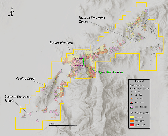 Figure 4 – Limousine Butte Project with historical antimony in rock chips and soils. The total strike length between Resurrection Ridge and Cadillac Valley is +5km. To view image please click here