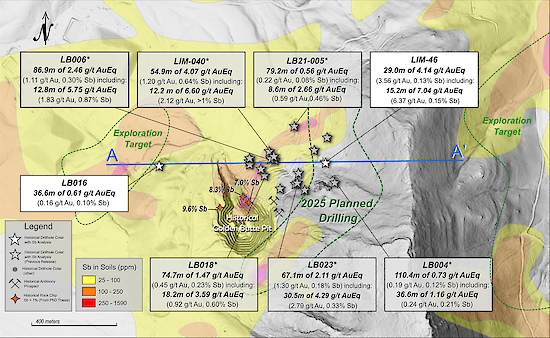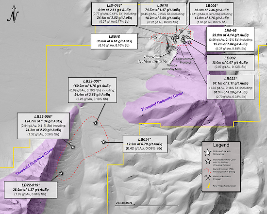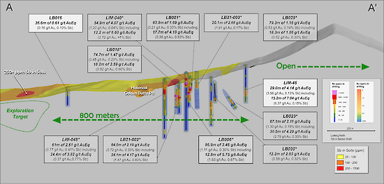 - LIM-46: 7.04 g/t AuEq* over 15.2 meters (6.37 g/t Au and 0.15% Sb), within 4.14 g/t AuEq* over 29.0 meters (3.56 g/t Au and 0.13% Sb)