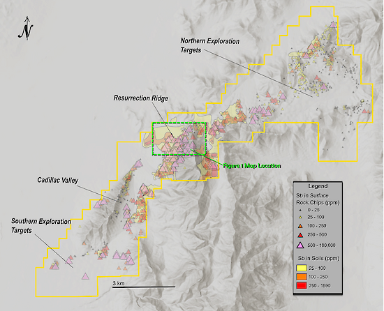 - Resurrection Ridge and Cadillac Valley oxide gold-antimony mineralization demonstrates the significant oxide gold-antimony potential across a large, open mineralized footprint (Figure 1, Figure 4)