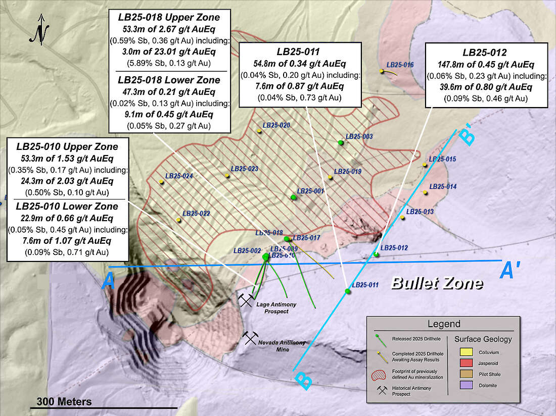 - LB25-018 Upper Zone (from surface, step-out, expansion from new drill pad): 23.01 g/t AuEq* over 3.0 meters (5.89% Sb and 0.13 g/t Au), within 2.67 g/t AuEq* over 53.3 meters (0.59% Sb and 0.36 g/t Au)