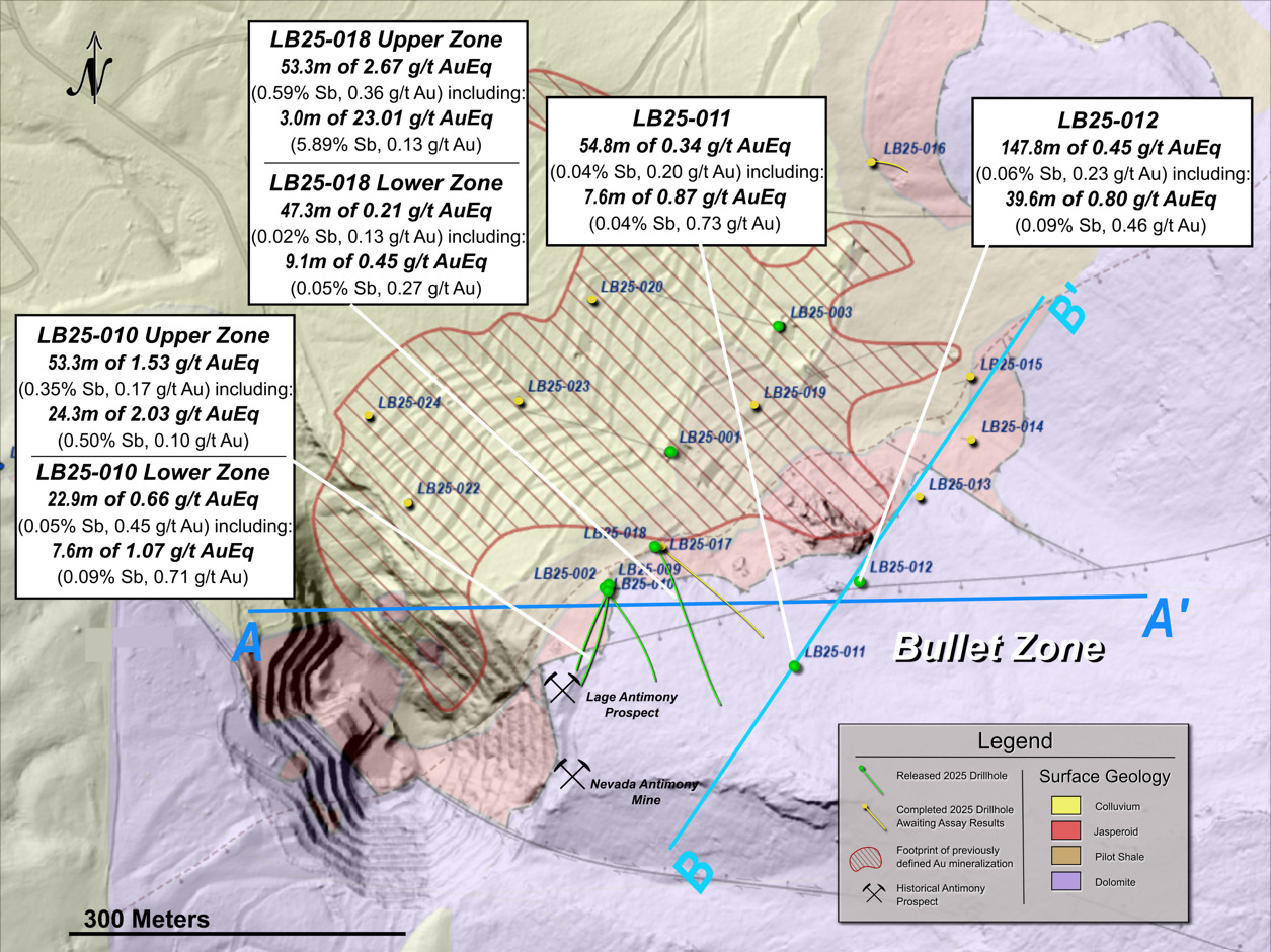 - LB25-018 Upper Zone (from surface, step-out, expansion from new drill pad): 23.01 g/t AuEq* over 3.0 meters (5.89% Sb and 0.13 g/t Au), within 2.67 g/t AuEq* over 53.3 meters (0.59% Sb and 0.36 g/t Au)