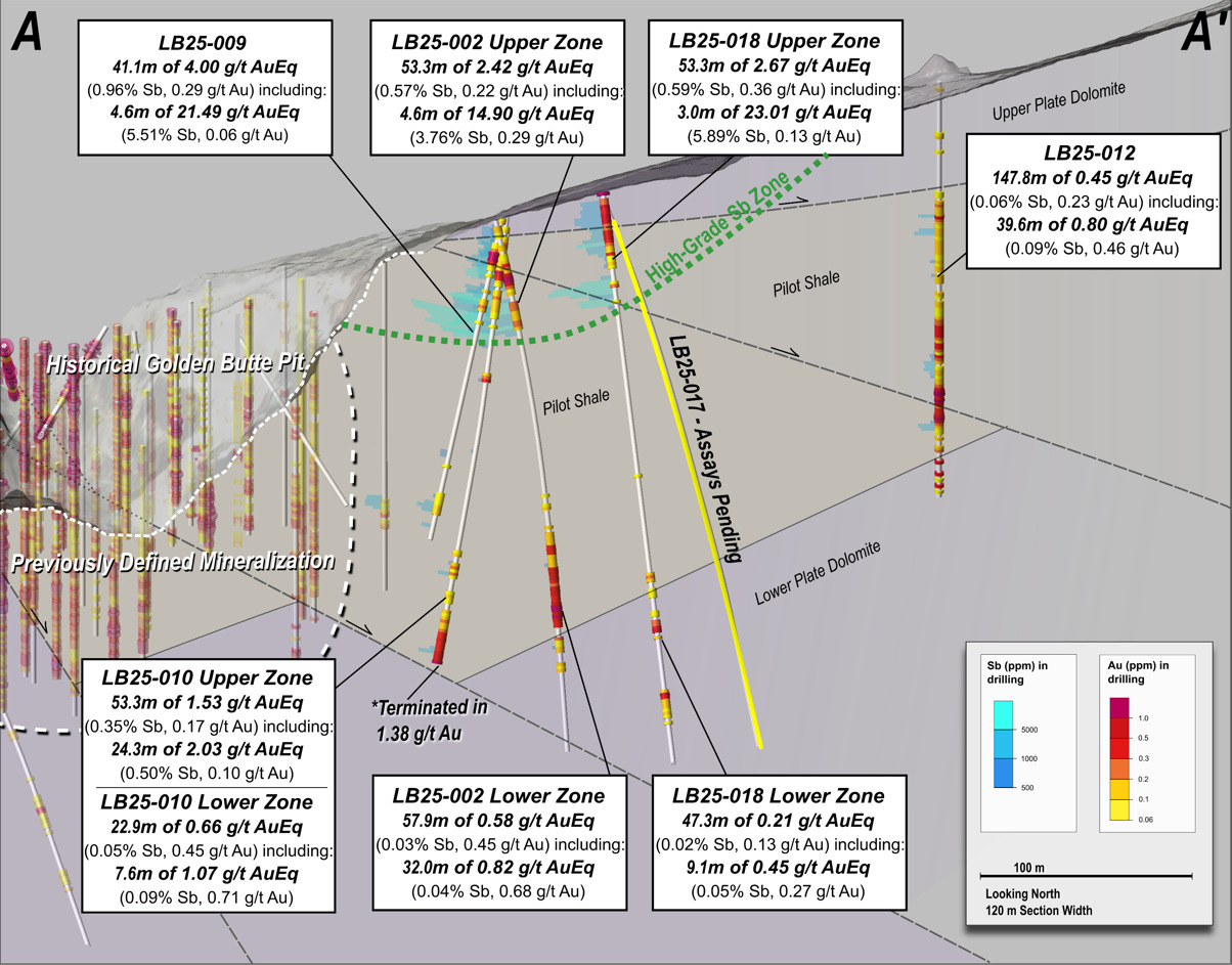 - LB25-010 Lower Zone (expansion): 1.07 g/t AuEq* over 7.6 meters (0.71 g/t Au and 0.09% Sb) within 0.66 g/t AuEq* over 22.9 meters (0.45 g/t Au and 0.05% Sb); Hole LB25-010 terminated in 1.38 g/t Au; follow-up drilling in 2026 is planned to expand the zone at depth