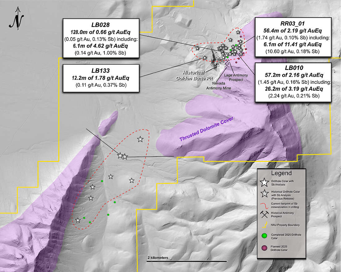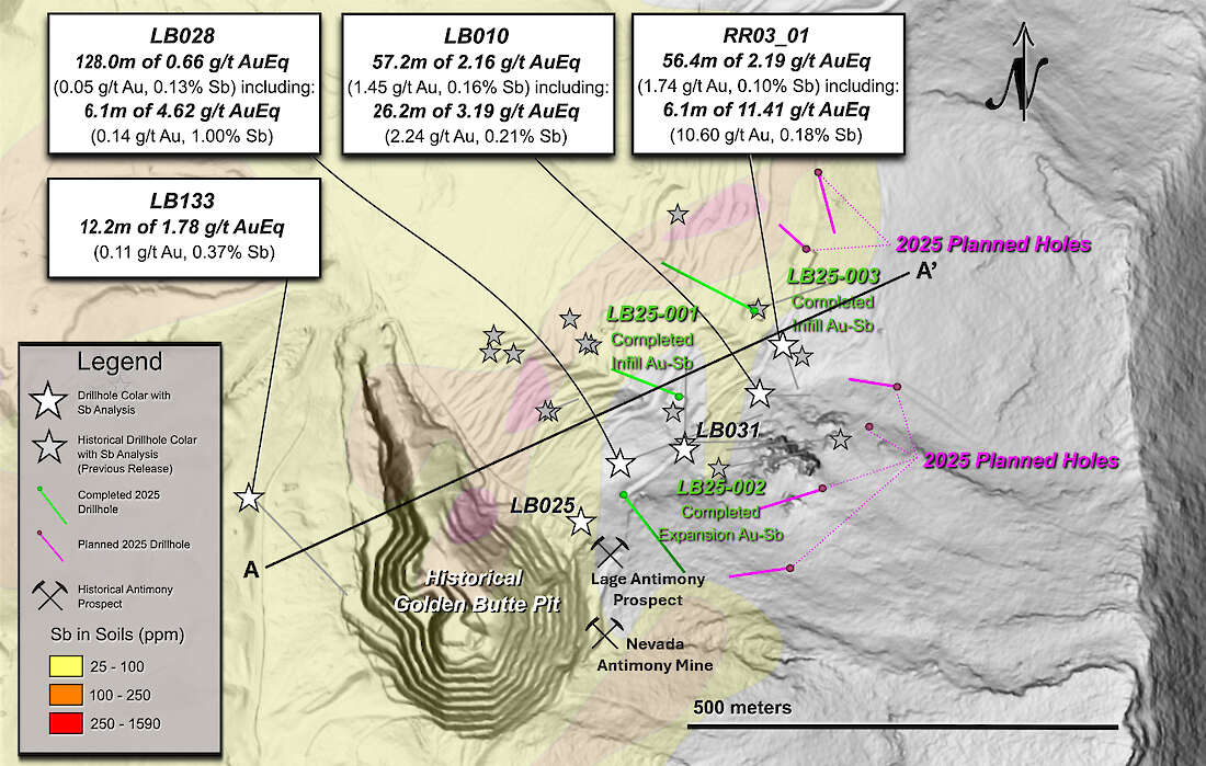 - LB028: 4.62 g/t AuEq* over 6.1 meters (0.14 g/t Au and 1.0% Sb) within 0.66 g/t AuEq* over 128.0 meters (0.06 g/t Au and 0.13% Sb)