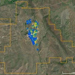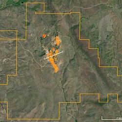 Figure 3 – Plan view map of Nutmeg Mountain gold project. Black line outlines the larger unpatented Bureau of Land Management (BLM) project boundary, with orange outline defining patented claims and private leases which do not have limitations on disturbance acreage allowed, and can be drilled with a notice to the State of Idaho. Blue dashed lines represent identified targets based on numerous geological data layers and work completed at the Project. To view image please click here