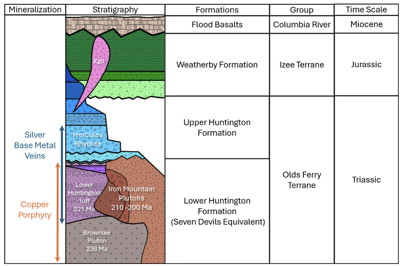 Figure 3 – Stratigraphy of the Hercules Copper Trend. The stratigraphy that is considered the most prospective to host porphyry copper mineralization includes the Lower Huntington Formation (purple) and Triassic age plutons (brown). Silver mineralization is known to be hosted in Upper Huntington Formation (blue), including the Hercules Rhyolite, as well as the underlying (older) stratigraphy.