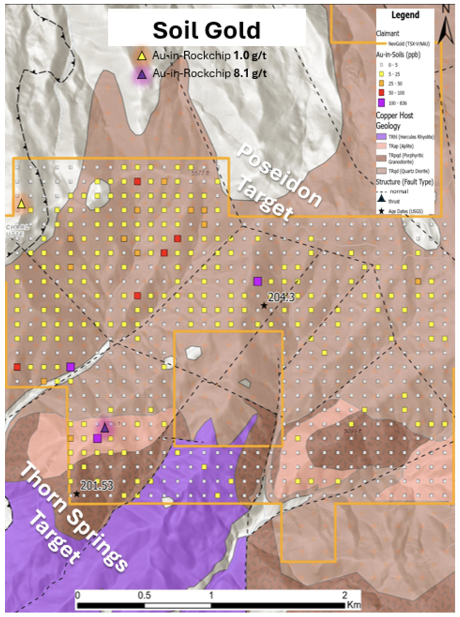 Thorn Springs target areas within BLM ground at the Zeus Copper Project.Figure 7 – Gold surface soil geochemical analysis and selected rock chips for the Poseidon and T