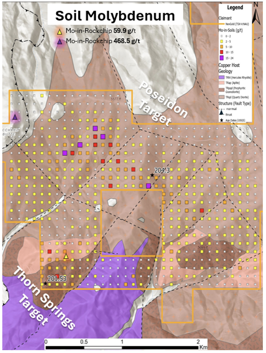 horn Springs target areas within BLM ground at the Zeus Copper Project.Figure 8 – Molybdenum surface soil geochemical analysis and selected rock chips for the Poseidon and
