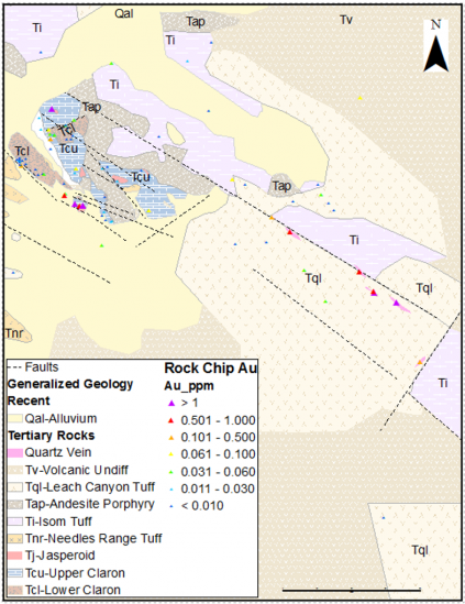 More recent exploration was done by McEwen between 2015 and 2017. This consisted of mapping, rock and soil geochem, and some limited RC drilling. This work has identified a number of gold target areas with drilling yielding gold mineralization of economic significance (16m @ 1.36 g Au/t and 10.7m @ 2.0 g Au/t). Future work will focus on compilation of all McEwen data and targeting of additional exploration programs in high-potential areas where the Claron formation is known to exist.
