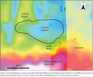 Regional gravity distinguishes between Tertiary volcanic rocks and the Paleozoic and Mesozoic older sedimentary rocks. The Claron Formation, forming the base of the Tertiary sequence, is located at the transition from higher-density Paleozoic and Mesozoic sedimentary rocks and lower density Tertiary volcanic rocks. The Caliente Caldron appears as a gravity low. Cedar Wash is located on a gradient between the volcanic center and the basement platform.