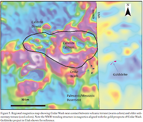 The regional magnetic map above shows magnetic highs associated with the volcanic rocks of the Caliente Caldron, contrasted with the lower magnetic sedimentary package. Cedar Wash lies at the southern edge of the volcanic field, along a regional NNW-trending feature in the magnetic data. The gold prospects at Cedar Wash are aligned with the magnetic feature, as are mineralized faults mapped in detail.